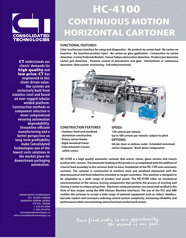 HC-4100 is a high quality automatic cartoner that erects, closes, glues cartons and inserts the product into the cartons. The automatic loading of the product is accomplished with the addition of a barrel feed assembly to a cartoner built on the basic foundation of the HC-120 semiautomatic cartoner. The cartoner is constructed of stainless steel and anodized aluminium with the pharmaceutical and food industries intended as target customers. This machine is designed to be adaptable to a wide range of product and speed ranges in order to offer the most utility. The HC-4100 relies on mechanical synchronization of the various moving components that perform the process of erecting and closing a carton to reduce setup time. Electronic setup parameters are saved and recalled, in the form of box recipes, using the HMI (Human Machine Interface). The values are loaded into the PLC (Programmable Logic Controller) program with the simple entry of a box number. These parameters will include pneumatic and glue functions that are controlled in relation to position of cartons on the cartoner chains enabling a wide range of throughput rates with minimal or no parameter adjustment. This use of the PLC and HMI enables the cartoner to accept a wide range of optional equipment such as coders, labellers, barcode readers, and conveyors reducing control system complexity, increasing reliability and performance while concentrating control functions to the touch screen. |